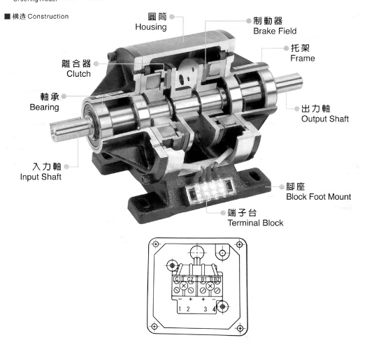 其之電樞與電磁剎車器則在同軸而形成的出力軸,電磁離合器之軛與電磁剎車器裝置于機架上。